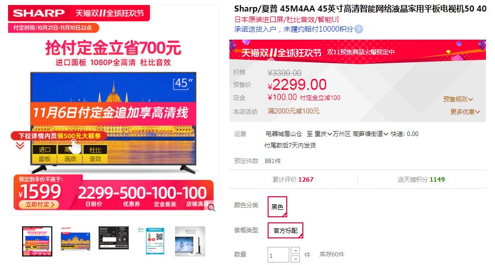 而夏普45M4AA预售价2299元,同样有付定金和满减活动,再加上500元的优惠券,到手价1599元,省了整整700元,力度更大。