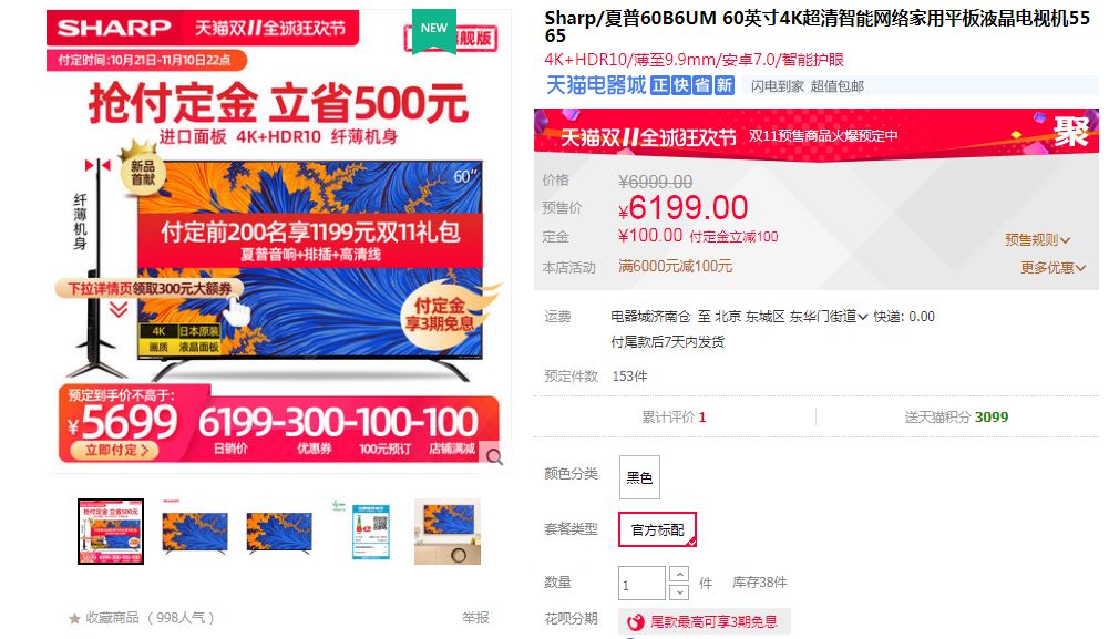 最后来说说怎么买最省钱。双十一期间,天猫和京东这样的主战场都有不少的优惠活动。比如在天猫商城中,夏普60B6UM预售价为6199元,还可以预付100元定金立减100元,店铺有满6000减100元的活动,还可以抢300元的优惠券,最后到手价只需5699元,比原价少了500元。