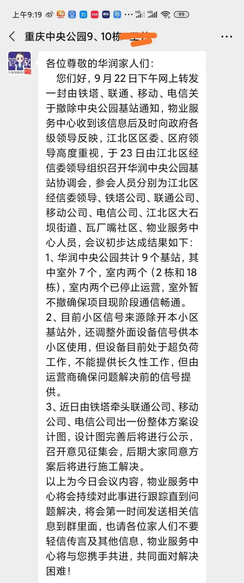 在劝解无效的情况下,铁塔、联通、移动、电信只得发出关于撤除重庆华润中央公园基站的通知。