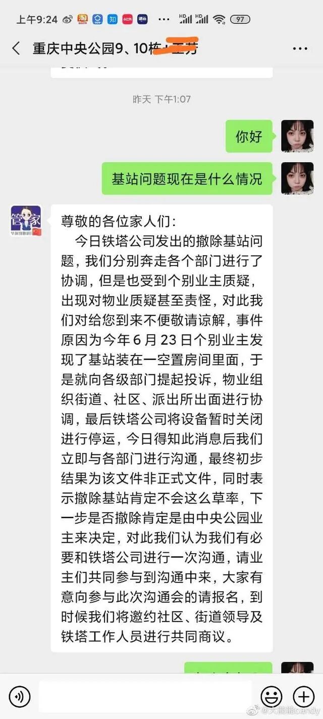 有华润中央公园小区业主在网上发出物业通知称,与各部门进行沟通后确认该文件非正式文件,同时表示撤除基站肯定不会这么草率,下一步是否撤除由中央公园业主来决定。物业人员还也表示将和铁塔公司进行沟通,并邀请业主们共同参与到沟通中来。