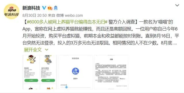 但从今年8月初开始,这款 App 开始出现无法顺利"卖猫"的情况,到了16日,该款 App 则彻底登录不上,这意味着很多用户在这款App上投入的买猫款收不回来,此时,很多用户才发觉自己上当并报警。相关律师表示,这类App是典型的"互助盘",其本身涉嫌违法。想利用"云养宠物"来赚钱,不止他们。