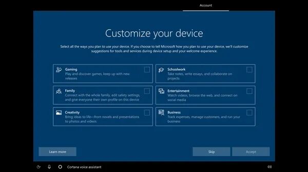 回到Build 20231版本上,官方日志中列出的新功能主要有两点,一是为首次开机部署增加了个性化的一键设置选项,比如游戏、学校、家庭、企业、创意、商业等场景化设置(如图所示)。