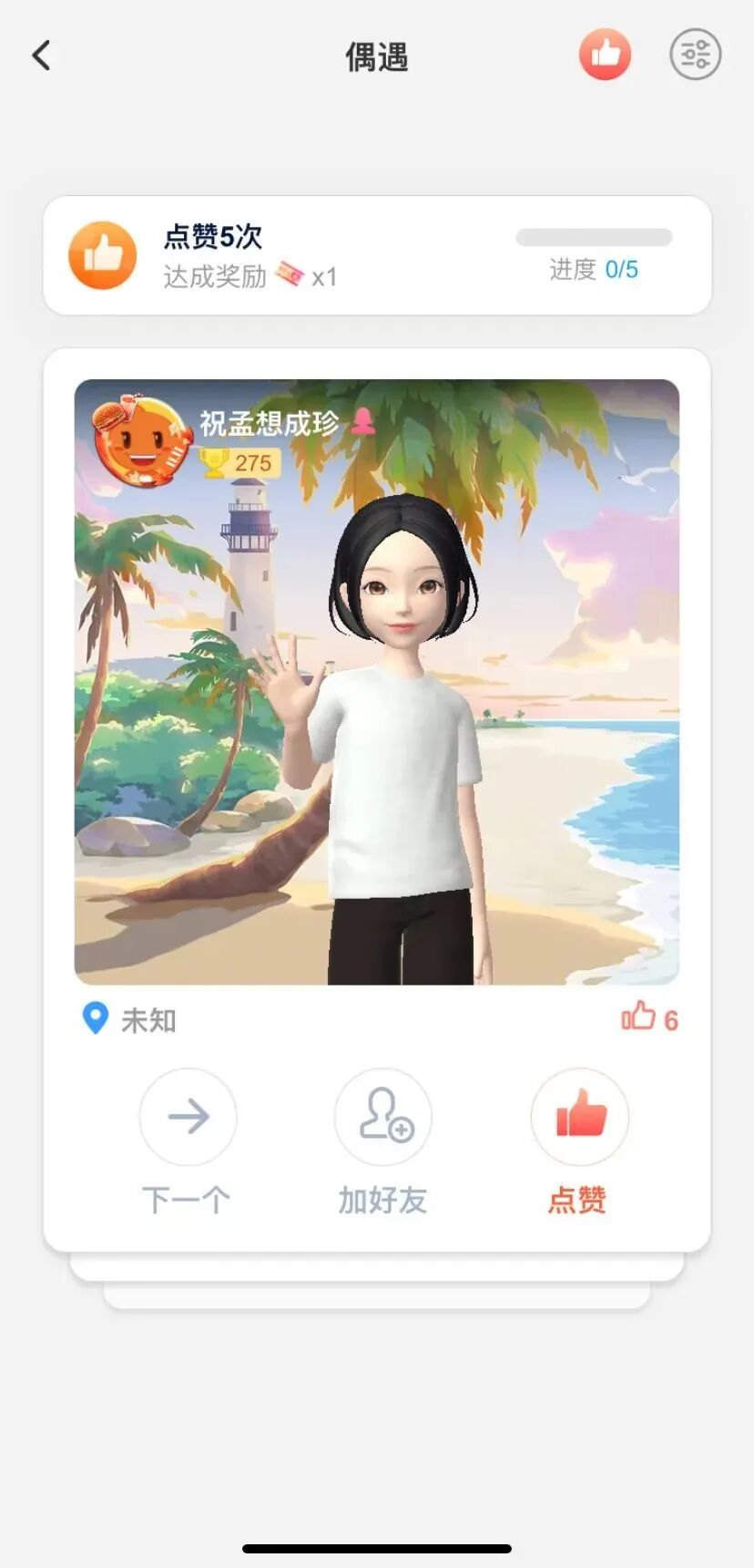 不过,在偶遇交友过程中,用户都是以虚拟 3D 形象出现的,并没有上传真人照片的入口。另外,虽然可以向陌生人送出虚拟礼物,或者为他们点赞,但无法看到对方的“相亲名片”,也无法直接给对方发消息。