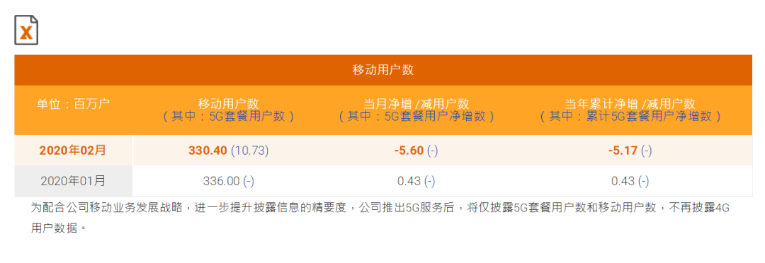 值得注意的是,中国电信已声明,为配合公司移动业务发展战略,进一步提升披露信息的精要度,公司推出5G服务后,将仅披露5G套餐用户数和移动用户数,不再披露4G用户数据。