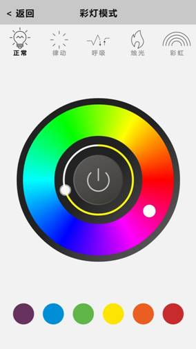 调节灯光很简单,移动手机APP外圈色盘上的白色圆点,音箱即可显示对应区域的颜色