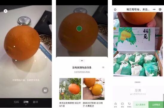 以食品为例,用户在线下通过微信「扫一扫」扫描某食品的包装袋之后,微信的识物能力会显示出该商品的价格信息、相关资讯以及商品介绍,点击商品之后直接进入小程序商城完成购买。