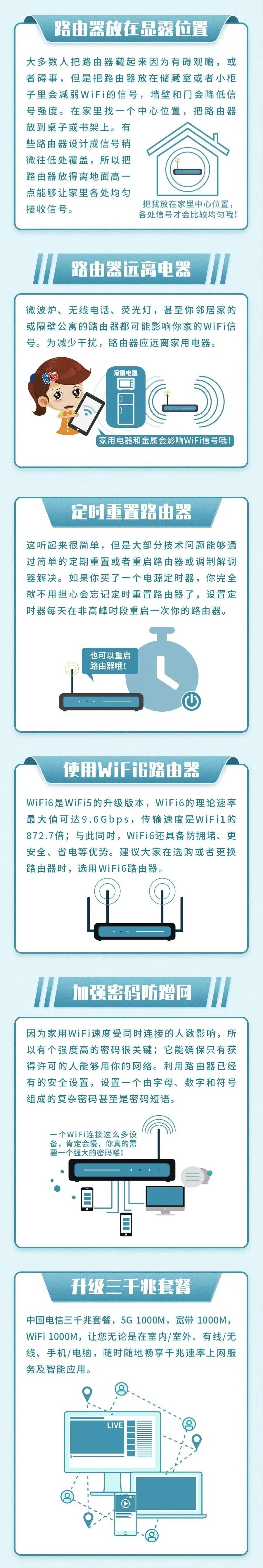 据说此次国庆不少景点依旧如往常那样人山人海挤成一堆,为了不浪费假期的一分一秒,聪明如小编选择宅在家里啦。不过,宅家里也有新的烦恼,网上冲浪不尽兴,上网一段时间后网速会变得很慢,或者观看影片到最精彩的片段就突然卡住不动了,偶尔连网页都打不开。这个时候就得看看家里WiFi了。相信这种家中WiFi信号不好或断断续续的情况不少人都遭遇过。怎么办呢?中国电信分享了几个小妙招,一起来看看: