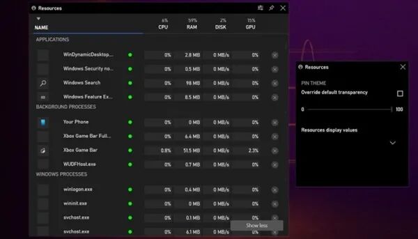 从实际演示效果看,Windows 10的现代资源监视工具出现在Xbox Game Bar小部件的菜单中。Xbox Game Bar Resources小部件可以帮助用户查找后台运行的进程(程序实例)及其系统使用情况的列表。它基本上使你可以监视可能在后台运行并影响游戏性能的资源密集型程序。