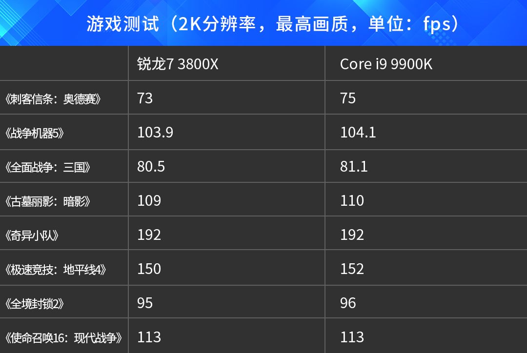 由于第三代锐龙大幅度提升了IPC性能,所以单核心性能的提升非常明显,同时内存延迟的降低,让其游戏性能相对前作有了长足的进步。在游戏实战中,虽然Core i9 9900KF凭借更高的加速频率稍有优势,但是实际上帧速的差别也仅有1~2fps,对游戏体验而言不会有任何区别。由于这次我们使用的是RTX 2080 Ti这样的顶级游戏显卡,显卡方面已经不是瓶颈,而玩家实际装机时,使用更低端一些的显卡的话,就更难有实际帧速上的区别了。从游戏性能上来说,锐龙7 3800X与Core i9 9900KF已经达到了同一水平。