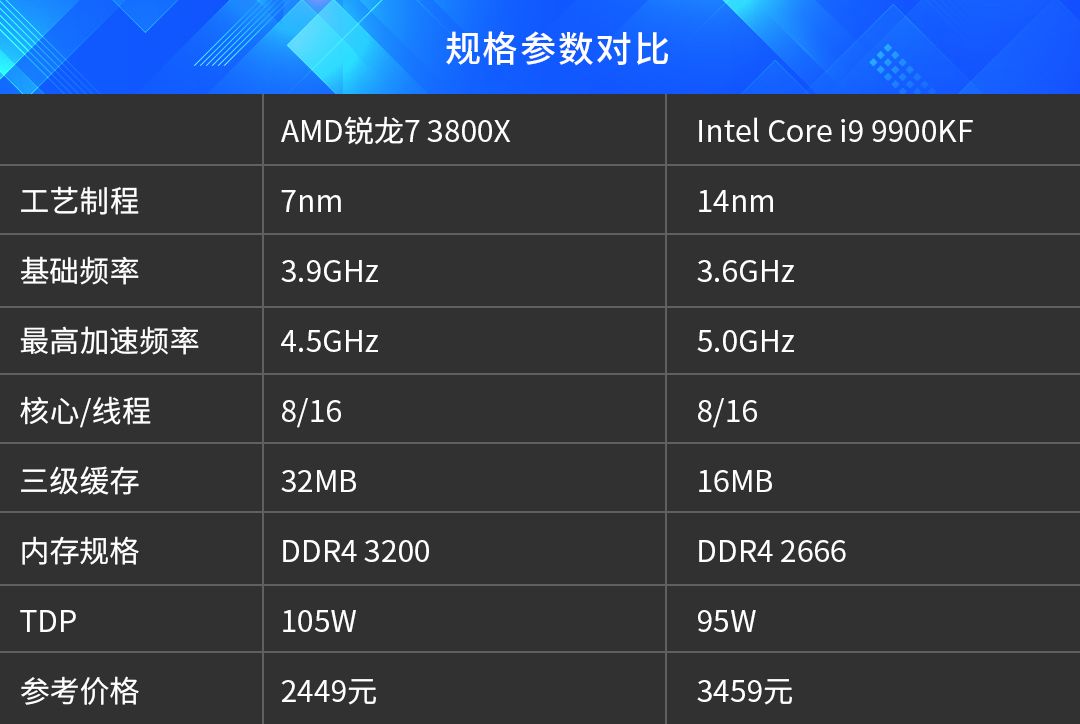 8核旗舰处理器比拼中 ,两个对位的竞品就是AMD锐龙7 3800X和Intel Core i9 9900KF。Intel Core i9 9900KF是Core i9 9900K去掉了核显的版本,而AMD锐龙7 3800X则相对于3700X有更高的频率,还解锁了更高的TDP,完全有挑战竞品旗舰Core i9 9900KF的实力。