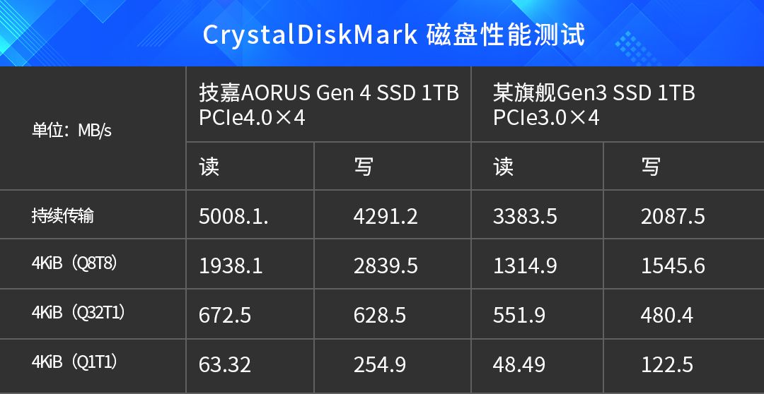 由于PCIe4.0大幅的提升了带宽,所以基于PCIe4.0的NVMe SSD能有更加强悍的磁盘性能。从测试来看,我们采用的这块技嘉AORUS Gen 4 SSD 1TB和PCIe3.0 SSD相比,在连续读取能力上提升了48%,在连续写入上更是直接翻倍。对于长期需要有大量文件拷贝的工作室用户来说,在时间和效率上提升可以说是非常明显了。