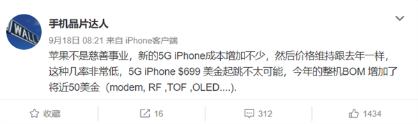 “苹果不是慈善事业,新的5G iPhone成本增加不少,然后价格维持跟去年一样,这种几率非常低,5G iPhone $699美金起跳不太可能,今年的整机BOM(物料清单)增加了将近50美金(modem, RF ,TOF ,OLED....).”