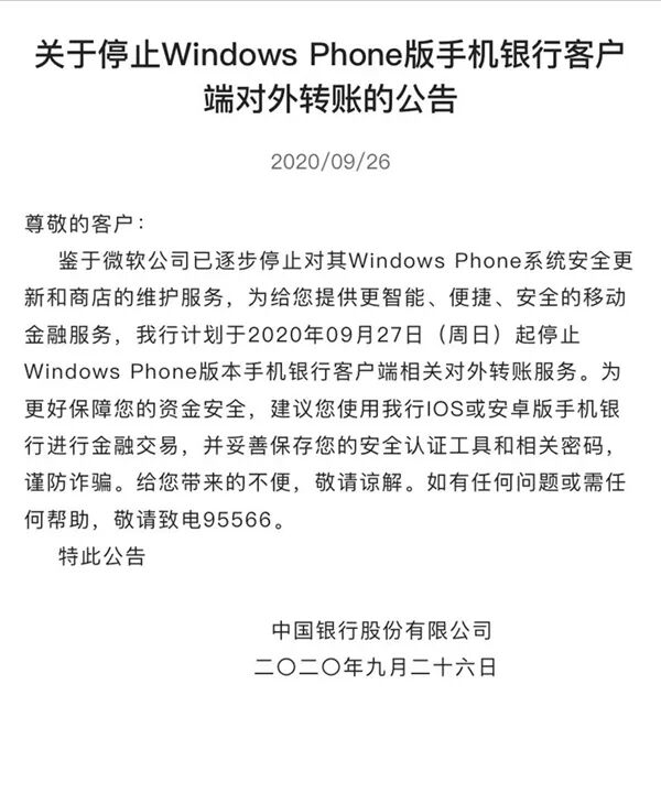 近日,中国银行宣布Windows Phone版手机客户端将于2020年9月27日停止对外转账服务。