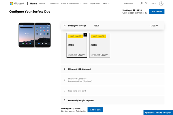 然而仅仅过了一个半月时间,微软Surface Duo在微软官方商城直降200美元(约合人民币1300多元),到手价为1199.99美元(约合人民币8000元)。