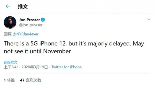 不过谈及支持5G的iPhone,Jon Prosser称支持5G网络的iPhone 12大概率要推迟发布了,可能要等到11月才会上市。虽然有所推迟,好在仍有望于今年秋天上市。