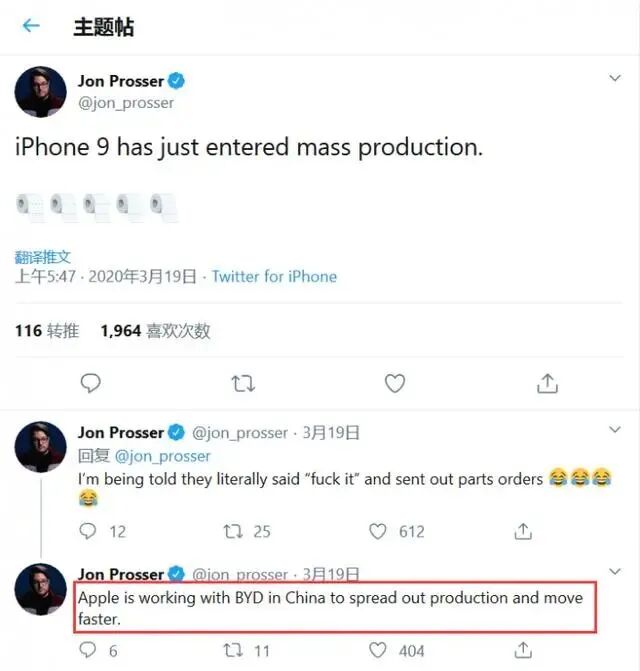 他在推文中用厕所卷纸代表信息的可靠性,在该条推文中使用了五卷厕纸,这意味着消息的准确性为100%。而在后续推文中,他还表示苹果公司正在和中国制造商比亚迪合作以加快生产进度。