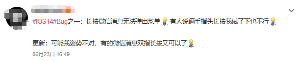 【电脑报在线】6月23日,WWDC20(苹果全球开发者大会)上,iOS 14 正式与大家见面,相比iOS 13而言,新增了不少功能。而最让用户期待的分屏操作、资源整合、小程序组件等等,的确方便了不少。于是,在收到了测试版推送之后,就有不少小伙伴升级了,没曾想,一时间,微博上就开始吐槽iOS 14诸多BUG了。